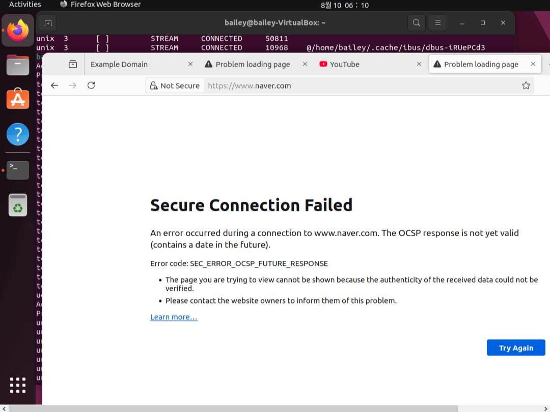 Oracle VirtualBox의 리눅스 환경에서 Firefox로 google.com은 정상적으로 접속됐으나 naver.com를 접속하려고 하니 아래와 같은 오류가 생겼다.